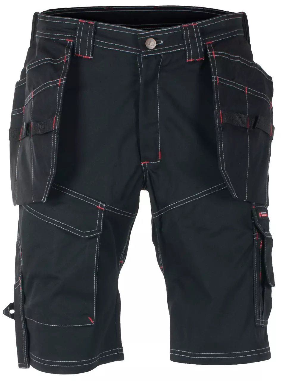 horts håndverk med stikklommer i front, hengelommer, baklommer, dobbelt tommestokklomme plassert over sidesøm på buksen. Lårlomme venstre side med mobillomme, lårlomme høyre side med ID-kortlomme. Feste for hammerholder begge sider i linning.